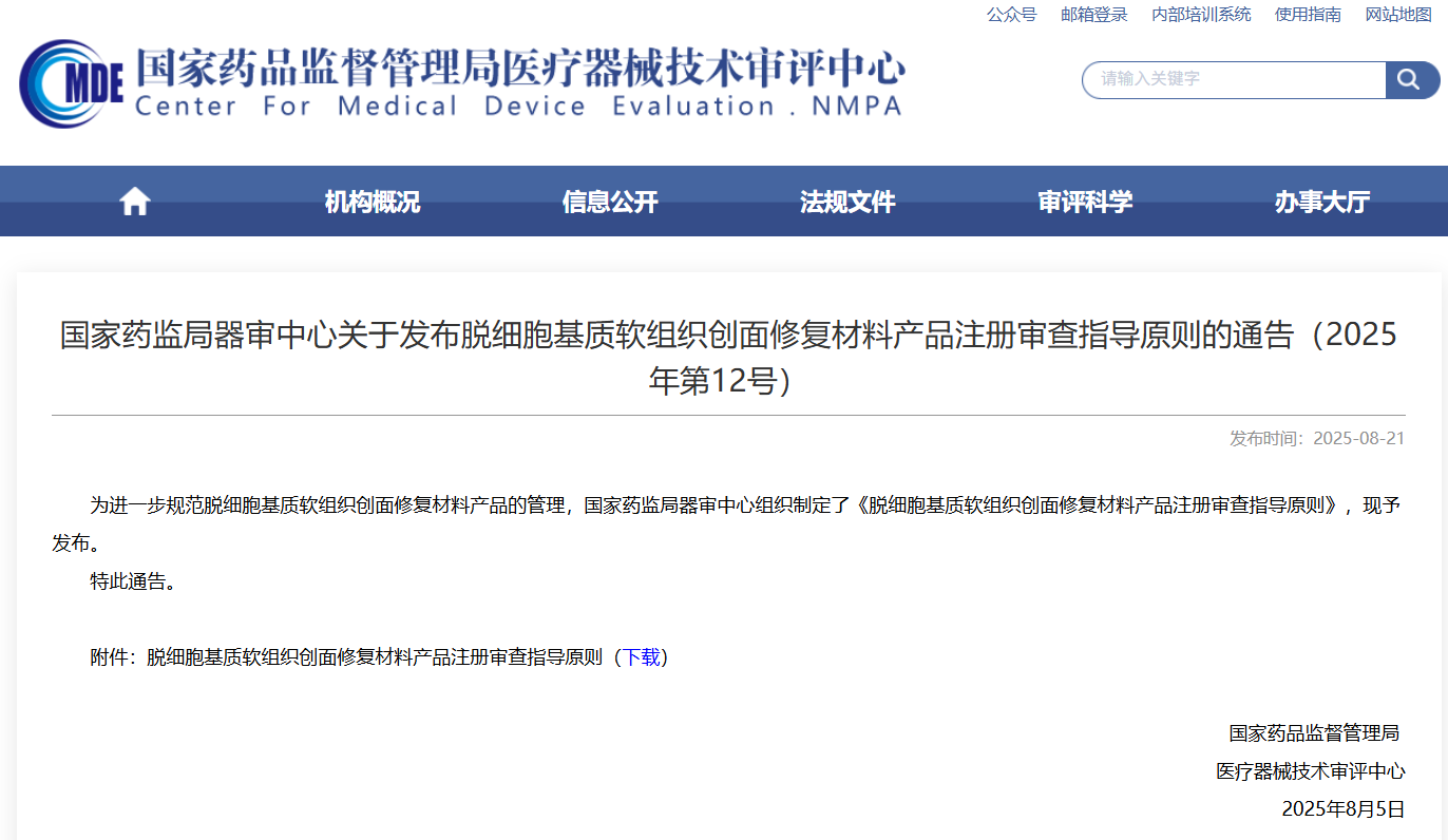 NMPA | 脱细胞基质软组织创面修复材料产品注册审查指导原则