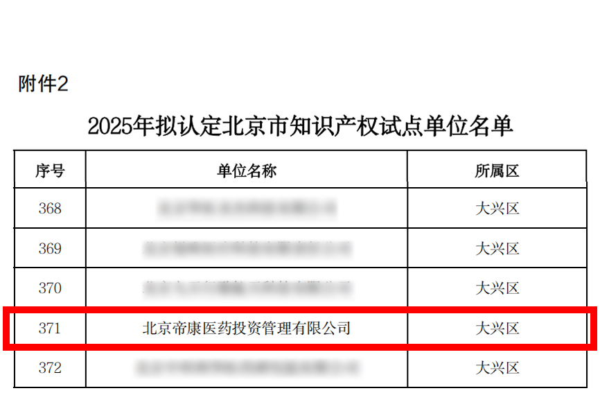 近日,北京市知识产权局正式发布《关于2025年拟认定北京市知识产权试点优势单位及复审通过单位名单公示的通知》,根据《北京市知识产权试点优势单位认定与管理办法》要求,奥泰康北京CDMO中心(北京帝康医药投资管理有限公司)正式获评“北京市知识产权试点单位”,这一荣誉是北京市知识产权局对企业核心创新能力与行业竞争力的高度肯定,标志着奥泰康北京CDMO中心在科技创新与成果转化迈出重要一步。