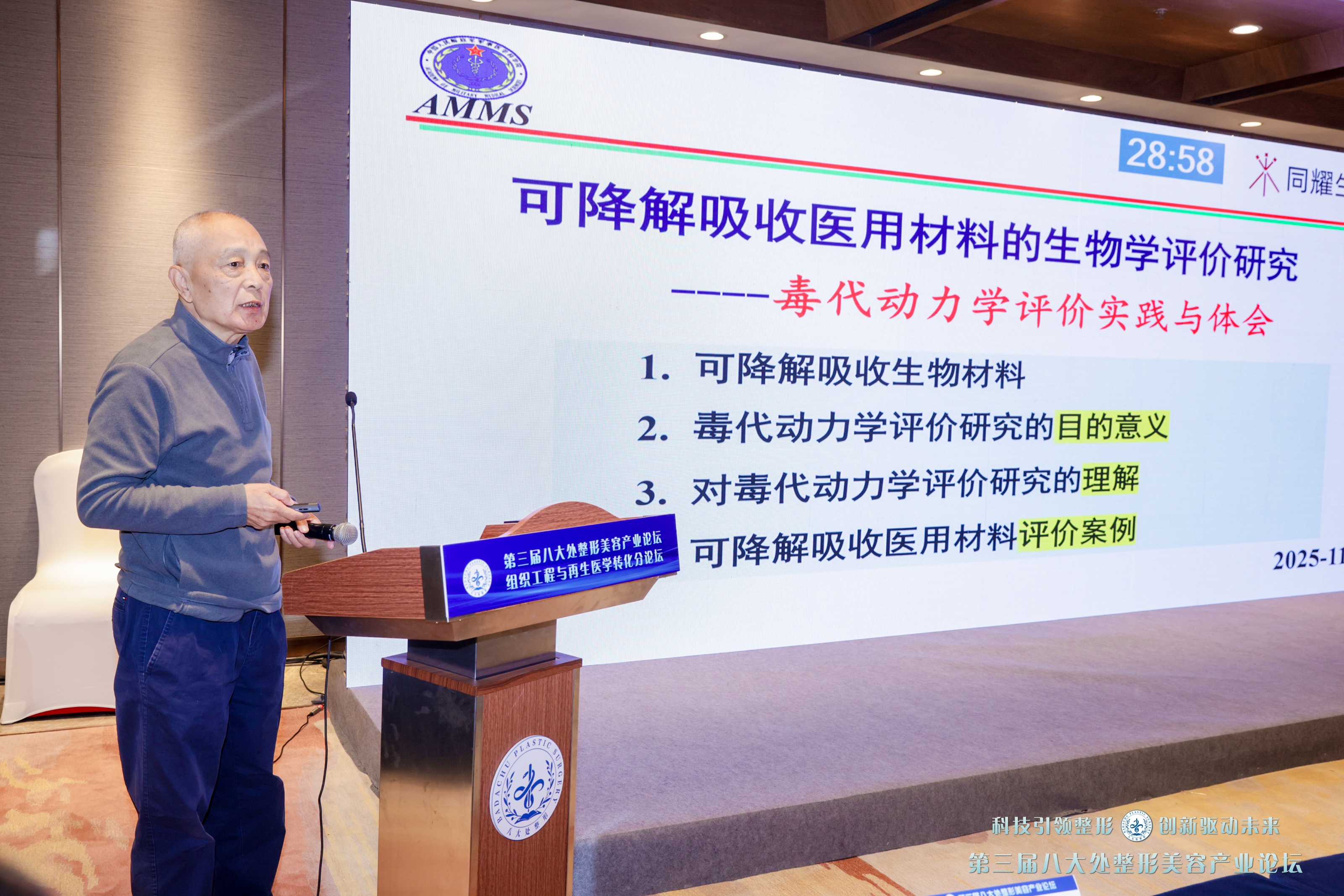 原军事科学院军事医学研究院研究员、CMDE/CDE咨询专家张振清教授介绍了《可降解吸收医用材料的生物学评价研究——毒代动力学评价实践与体会》。他强调,毒代动力学评价对确保材料临床安全性、理解毒性机制及支撑材料研发至关重要,包括暴露 - 毒性关系分析、安全范围评估和降解产物行为分析。他还分享了放射性标记示踪等关键技术,并结合硬脑膜封合胶、止血纱布等案例,阐释了毒代动力学在材料生物学评价中的实践应用与科学价值。