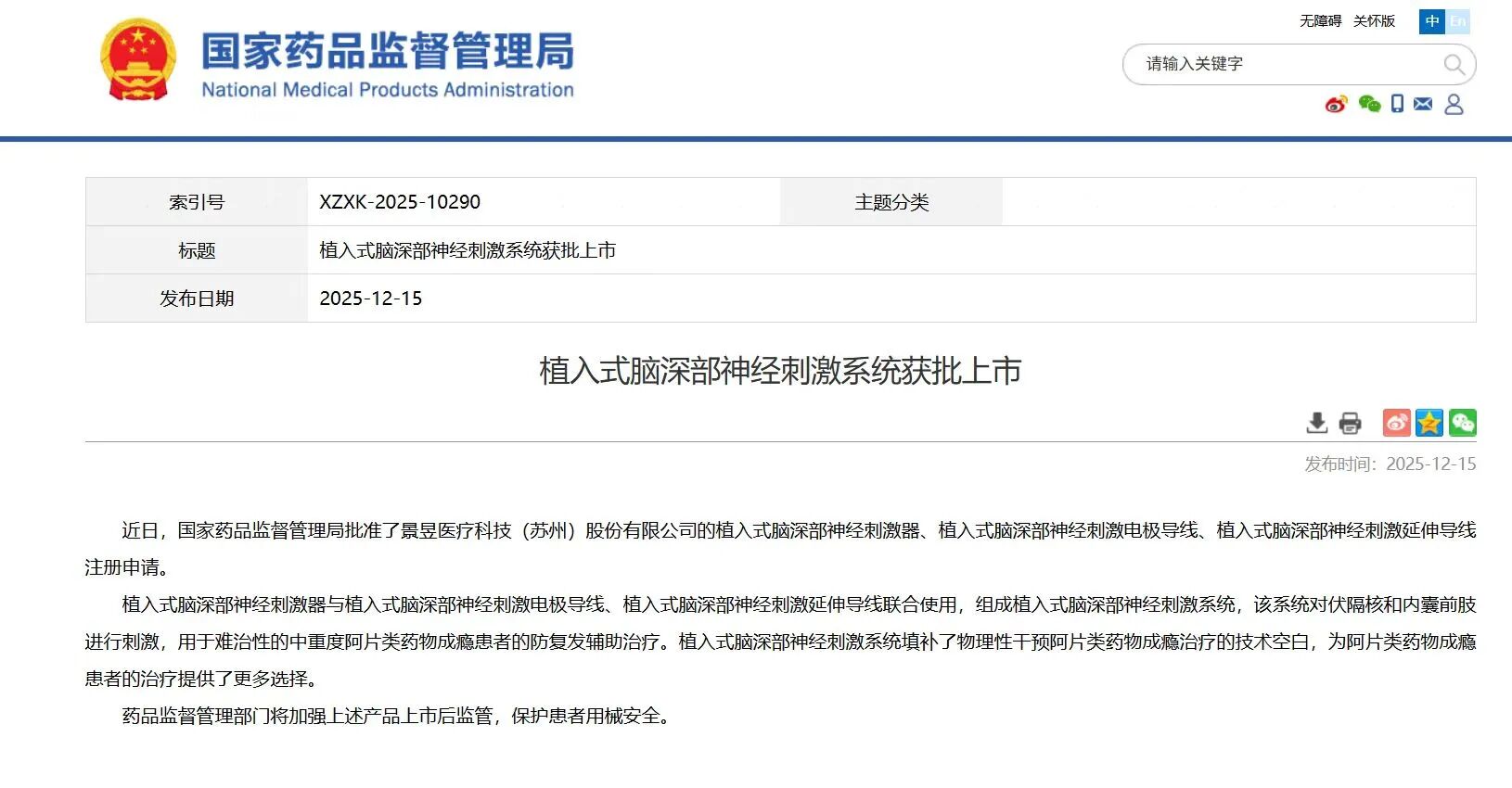 MA成果[庆祝] 奥泰康助力景昱医疗「植入式脑深部神经刺激系统」获批上市[烟花] ——系本年度助力获得的第17张三类注册证🌈 ——全球首个、中国首个侵入式脑机接口治疗成瘾类精神疾病产品[太阳]MA成果