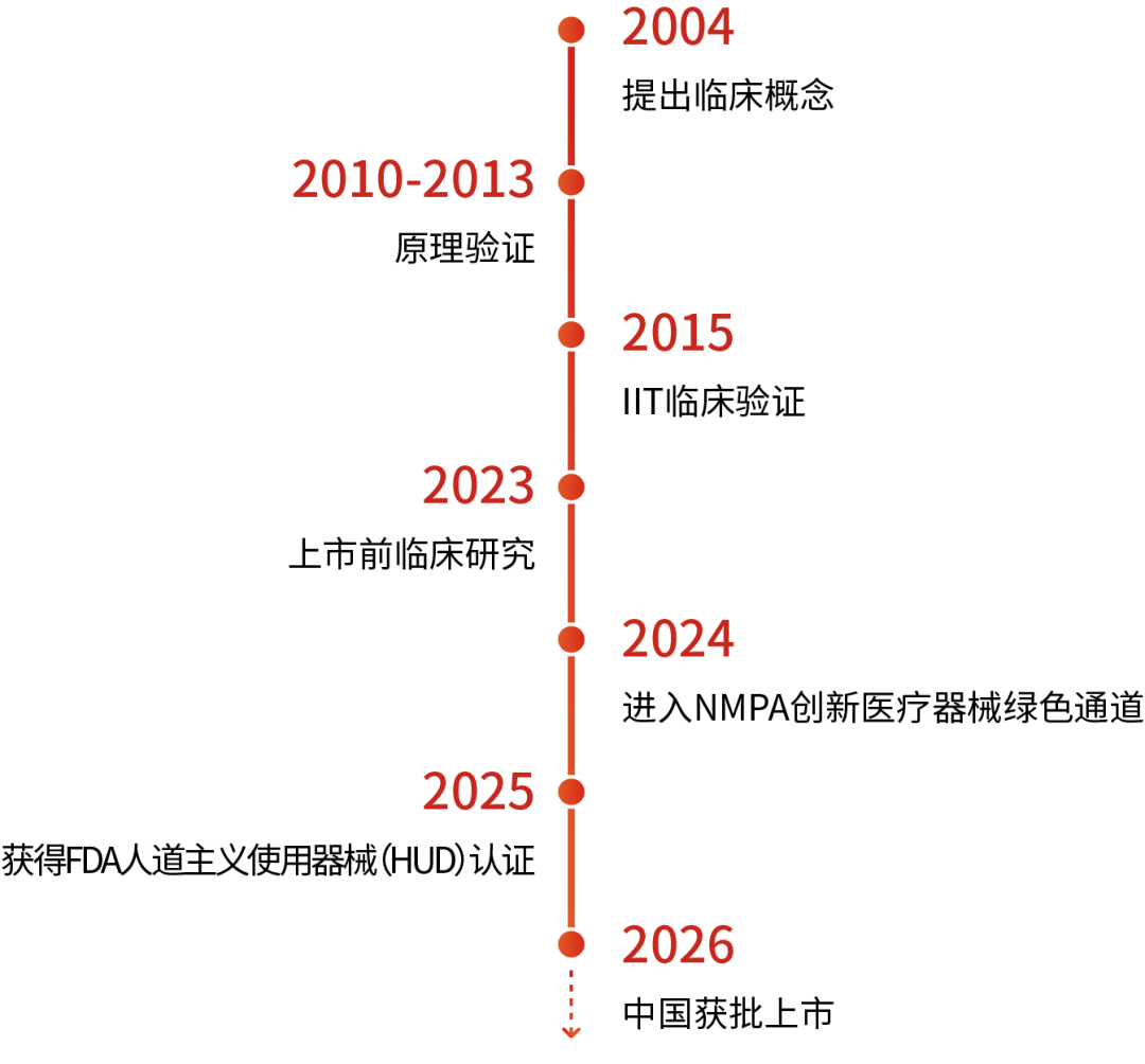 该产品已于2024年1月进入国家药监局创新医疗器械“绿色通道”,并于2025年6月获美国FDA的HUD认定。中美双重认证的全球首创产品在中国率先获批,彰显了中国创新实力与审评效率。