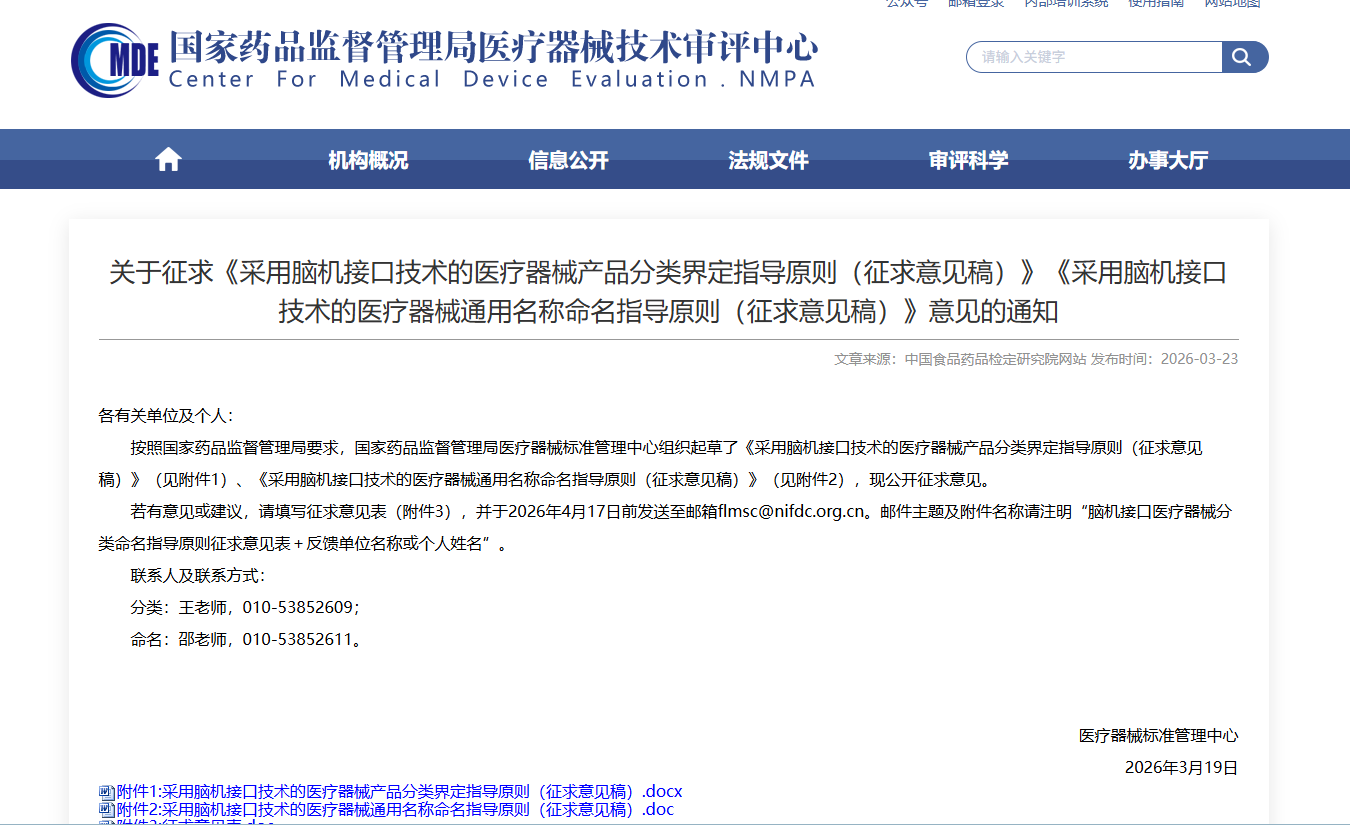 若有意见或建议,请填写征求意见表(附件3),并于2026年4月17日前发送至邮箱flmsc@nifdc.org.cn。邮件主题及附件名称请注明“脑机接口医疗器械分类命名指导原则征求意见表+反馈单位名称或个人姓名”。
