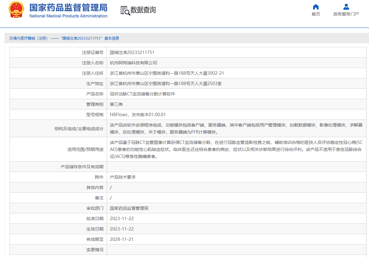 近日,国家药监局网站公开发布了最新一批三类医疗器械批准清单,杭州阿特瑞科技有限公司研发的《冠状动脉CT血流储备分数计算软件》(简称FFRCT)已经获批上市(图1),该软件核心算法完全自主研发,不受制于人。该产品由中美团队联合研发,双院士团队临床验证,是目前国内唯一采用全三维流体力学方程+超级计算机计算且被商业保险公司认可的产品,也是目前被国家药监局认可不需要在“灰区”(介于0.75至0.85)和冠脉弥漫性病变进一步研究的无创医疗产品。