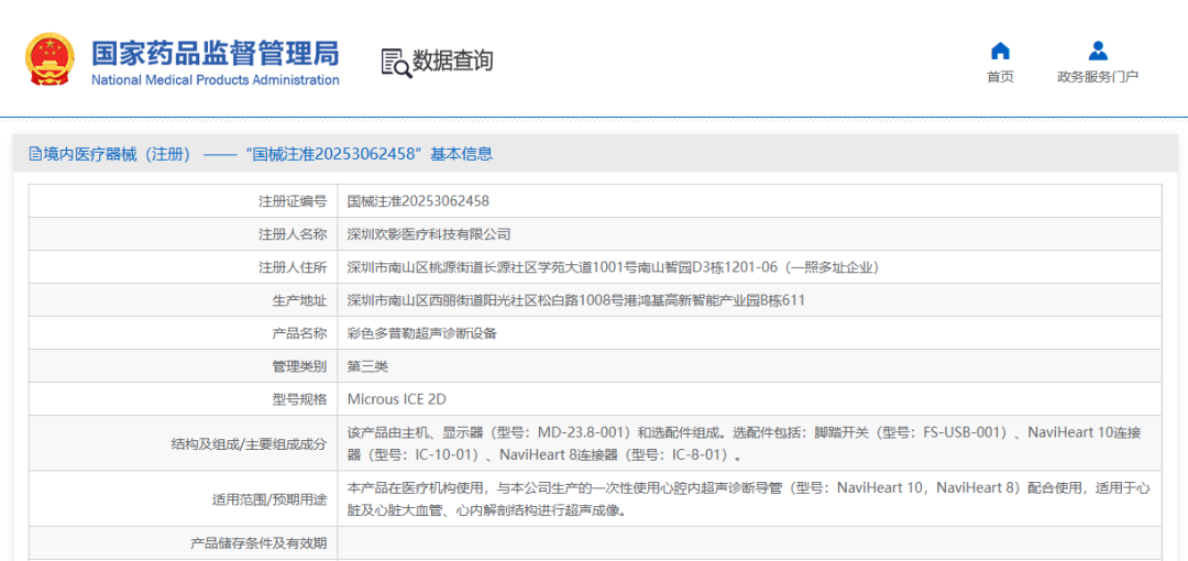 近日,欢影医疗自主研发的“彩色多普勒超声诊断设备”已正式获得国家药品监督管理局批准(注册证号:国械注准20253062458)。该设备与此前获批的“一次性使用心腔内超声诊断导管”共同构成完整的超高端心腔内超声成像系统,标志着全球首款80阵元大孔径心腔内超声高端成像系统实现了从关键部件到整机系统的自主研发与生产。