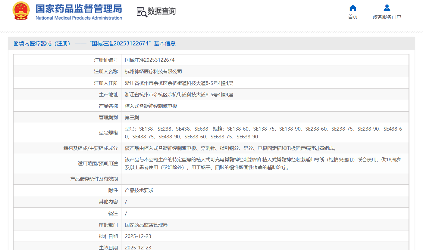 MA成果[庆祝] 奥泰康助力神络医疗「植入式脊髓神经刺激电极」获批上市[烟花] ——系本年度助力获得的第20张三类注册证🌈近期,经国家药品监督管理局公示,杭州神络医疗科技有限公司自主研发的产品植入式脊髓神经刺激电极(国械注准20253122674)获得NMPA批准上市,奥泰康提供MA解决方案。