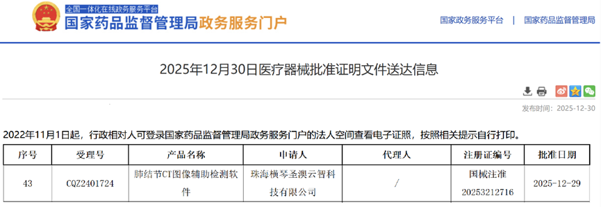 2025年12月31日,经国家药品监督管理局公示,珠海横琴圣澳云智科技有限公司的肺结节CT图像辅助检测软件(国械注准 20253212716)获得NMPA批准上市,奥泰康提供MA解决方案。