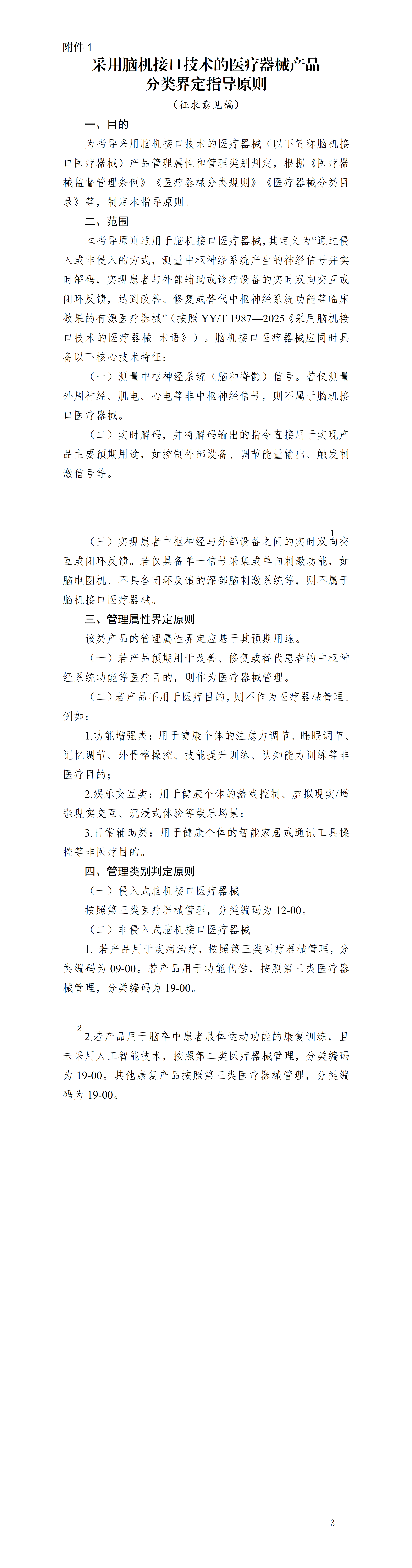 附件1.采用脑机接口技术的医疗器械产品分类界定指导原则(征求意见稿)